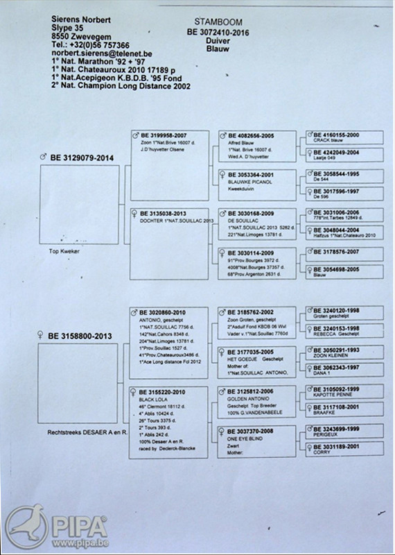 獲得比利時亞精頓 I全國(成鴿組)11.825羽冠軍為希倫斯.諾伯特(Sierens Norbert)鴿舍,該舍冠軍鴿B16-3072410灰公,是在比利時時間6月23日(星期六)下午13時38分27秒歸巢,翔距489.23公里,創下平均分速1227.83米/分。