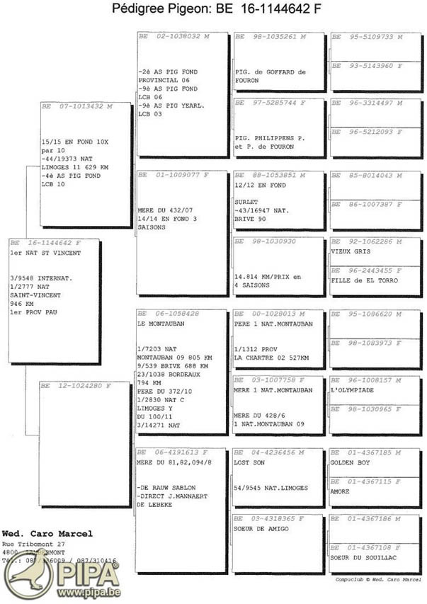 2018年聖維仙國際賽獲得比利時全國2.777羽冠軍為卡羅.吉恩-馬克(Caro Jean-Marc)鴿舍,該舍冠軍鴿B16-1144642銀母,是在比利時時間7月13日(星期五)晚上21時31分09秒歸巢,翔距940.843公里,創下平均分速1080.00 米/分。