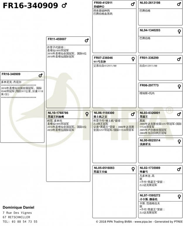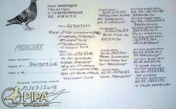 獲得法國聖維仙全國3.076羽冠軍多明尼克.丹尼爾(Dominique Daniel)鴿舍,該舍冠軍鴿FR16-340909班公,是在比利時時間7月13日(星期五)晚上20時40分05秒歸巢,翔距917.120公里,創下平均分速1118.33米/分。