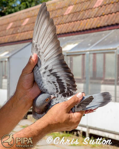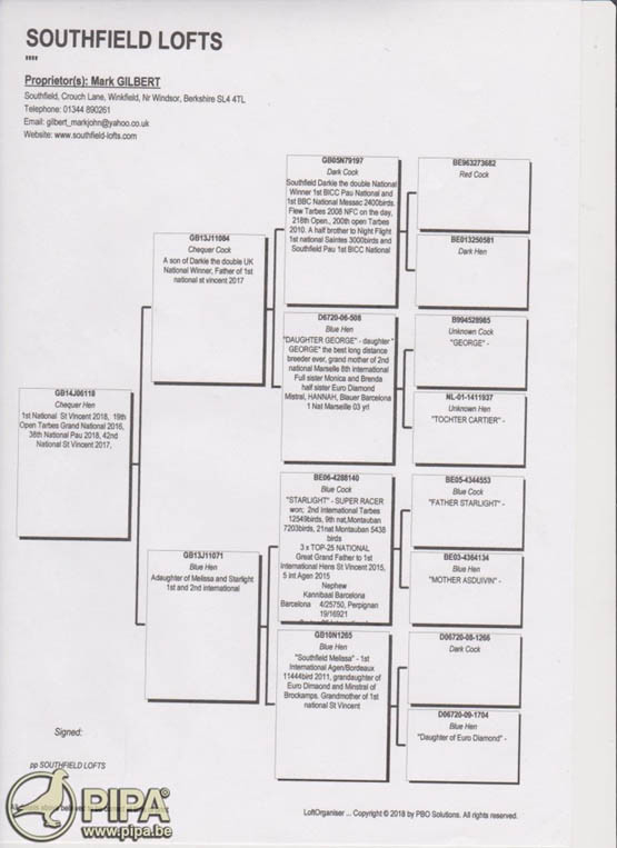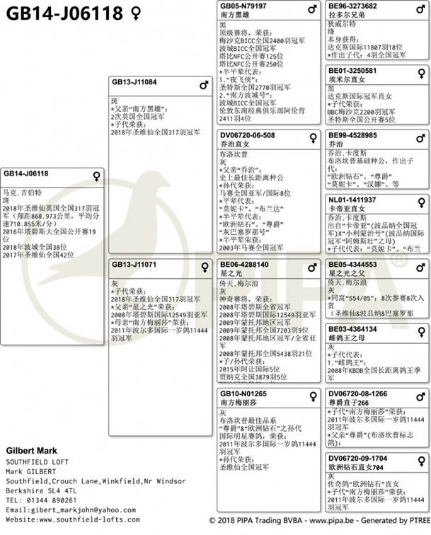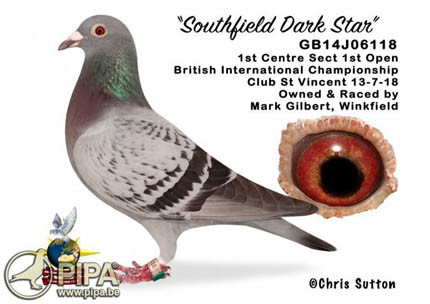 獲得聖維仙國際賽英國全國317羽冠軍馬克.吉伯特(Gilbert Mark)鴿舍,該舍冠軍鴿GB14-J06118斑母是在比利時時間7月14日(星期六)早上08時45分26秒歸巢,翔距868.973公里,創下平均分速710.855米/分。