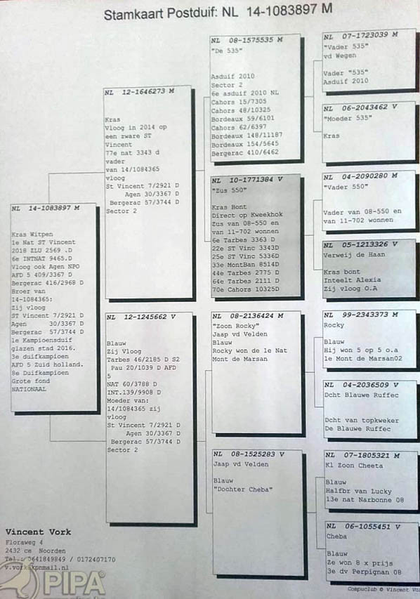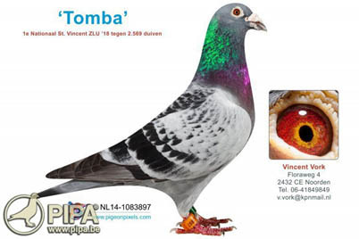 聖維仙國際賽獲得荷蘭全國2.569羽冠軍沃克.文森特(Vork Vincent)鴿舍,該舍冠軍鴿NL14-1083897斑公是在比利時時間7月14日(星期六)早上06時06分29秒歸巢,翔距1051.62公里,創下平均分速1066.03米/分。