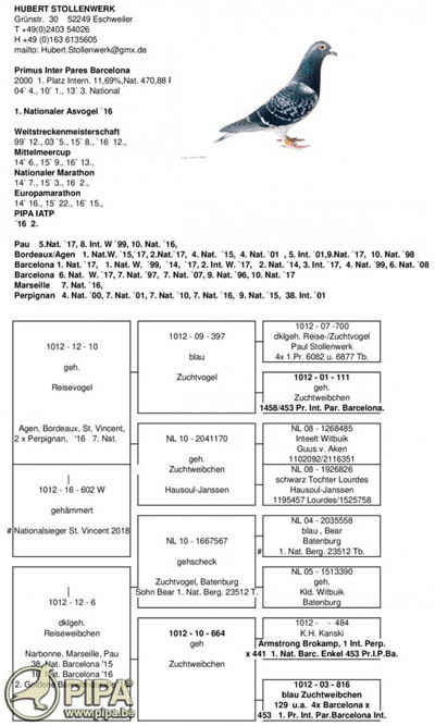 聖維仙國際賽德國全國767羽冠軍為斯托倫維克.休伯特(Stollenwerk Hubert)鴿舍