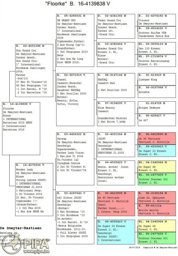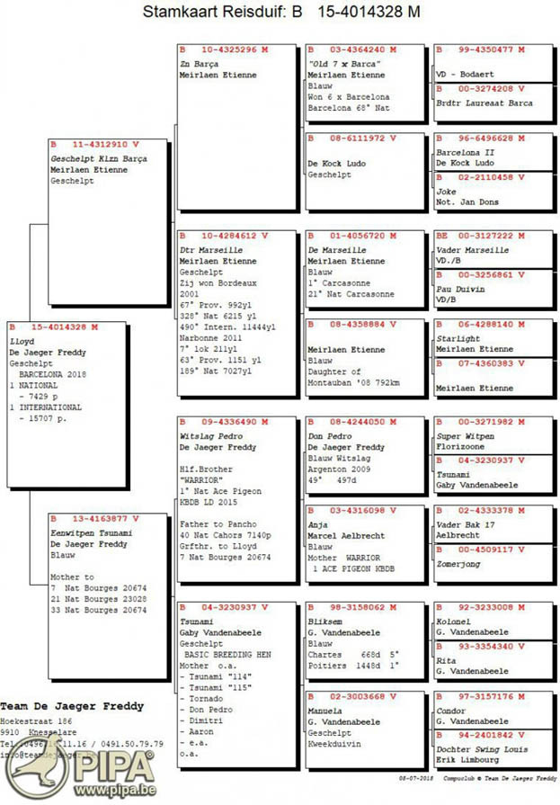 獲得2018年巴賽隆納國際總冠軍狄傑克.福雷迪(Team De Jaeger Freddy)團隊,該舍冠軍鴿B15-4014328斑公是在比利時時間7月8日(星期日)早上10時14分48秒歸巢,翔距1087.26公里,創下平均分速952.23米/分。