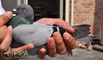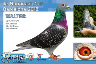 獲得巴賽隆納荷蘭全國冠軍迪布恩.J.L.(de Bruine J.L.)鴿舍,該舍冠軍鴿NL15-3537577斑公是在比利時時間7月8日(星期日)中午13時02分59秒歸巢,翔距1151.56公里,創下平均分速879.07米/分。