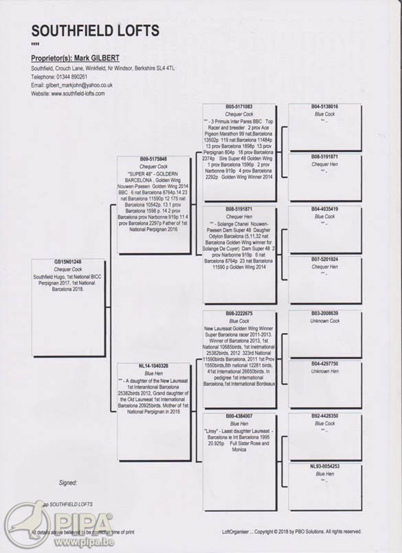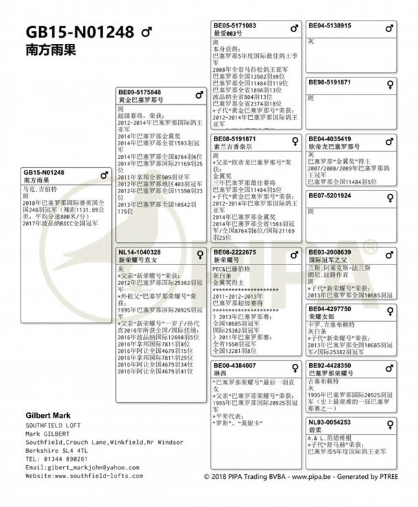 巴賽隆納英格蘭全國冠軍馬克.吉伯特(Gilbert Mark)鴿舍,該舍冠軍鴿GB15-N01248斑公是在比利時時間7月8日(星期日)中午14時47分52秒歸巢,翔距1131.89公里,創下平均分速800米/分。