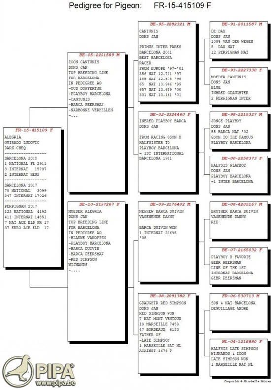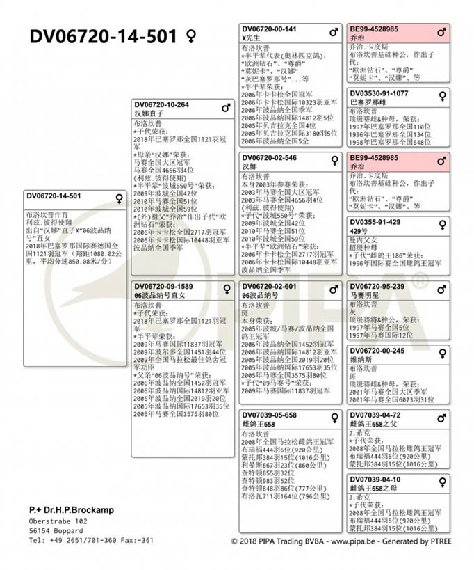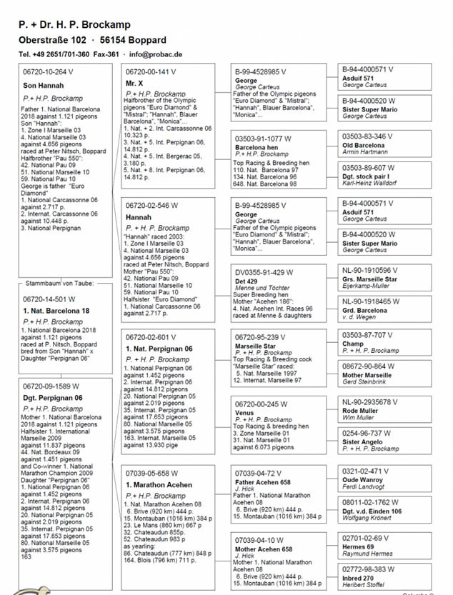 獲得巴賽隆納德國全國冠軍里茲.彼得(Nitsch Peter)鴿,該舍冠軍鴿DV06720-14-501斑母(布洛肯普鴿舍作出)是在比利時時間7月8日(星期日)中午12時33分20秒歸巢,翔距1080.02公里,創下平均分速850.08米/分。