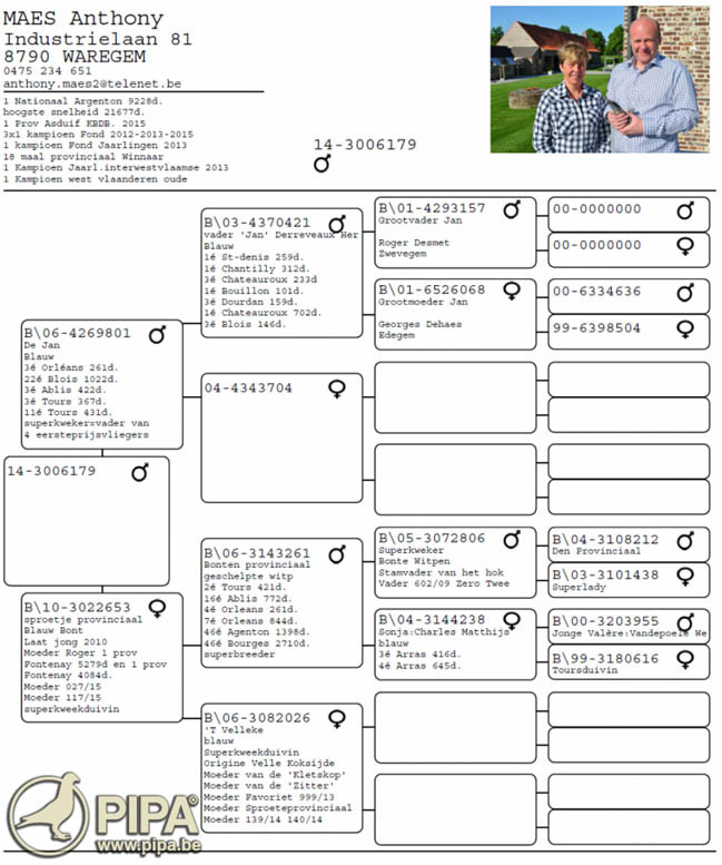 獲得比利時查特盧斯II成鴿8.741羽全國冠軍為羅傑.威勒(Velle Roger)鴿舍,該舍冠軍鴿B14-3006179灰公是在比利時時間7月7日(星期六)中午13時05分00秒歸巢,翔距482.343公里,創下平均分速1221.12米/分,此鴿同時也是此回查特盧斯II國家賽交鴿總數21.843羽的總冠軍鴿。