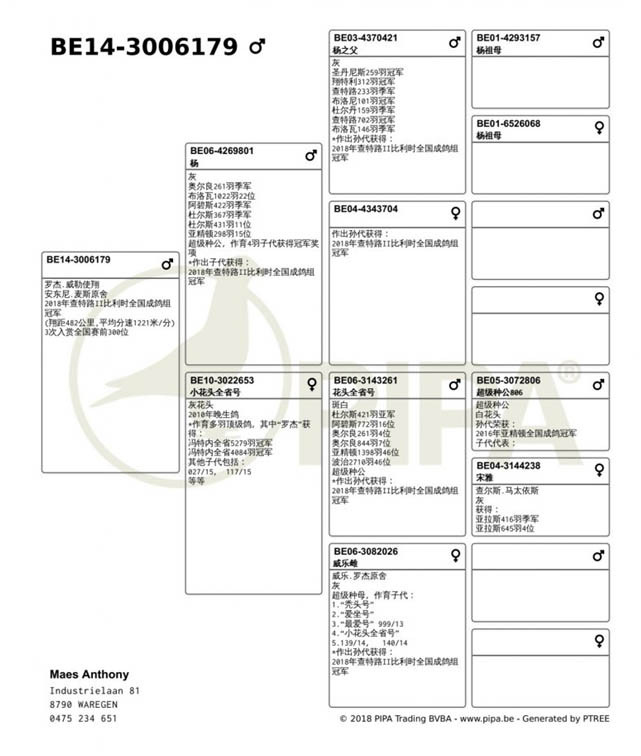 比利時查特盧斯II全國21.843羽總冠軍B14-3006179灰公 中文翻譯血統書