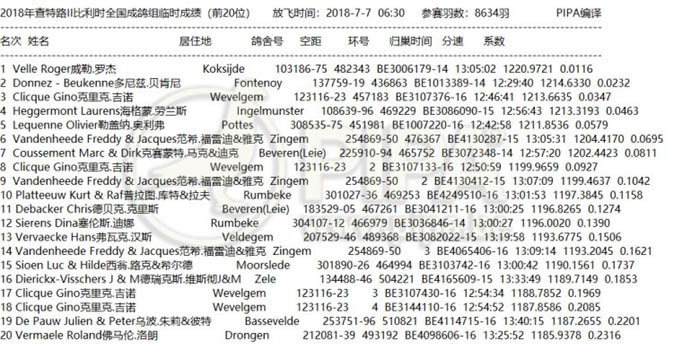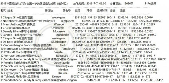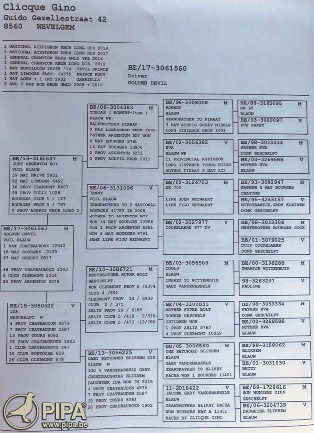 獲得比利時查特盧斯II一歲鴿13.102羽全國冠軍為吉諾.克裡克(Clicque Gino)鴿舍,該舍冠軍鴿B17-3061560灰公是在比利時時間7月7日(星期六)中午12時48分17秒歸巢,翔距457.183公里,創下平均分速1208.57米/分。