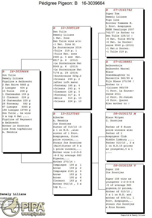 獲得2018年利蒙治II國家賽(成鴿)全國7.232羽冠軍為德梅利.麗麗安(Demely Liliane)鴿舍,該舍冠軍鴿B16-3039664灰公是在比利時時間7月7日(星期六)下午15時28分50秒歸巢,翔距605.683 公里,創下平均分速1156.25米/分,此鴿同時也是利蒙治II國家賽交鴿總數14.420羽總冠軍鴿。