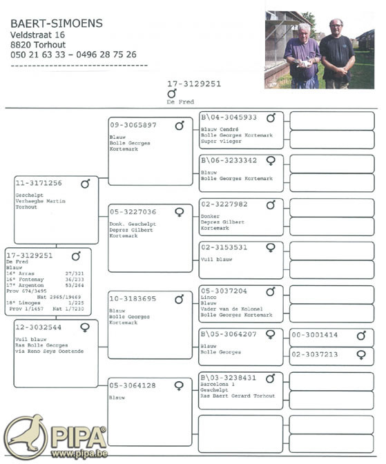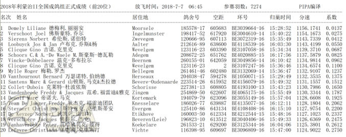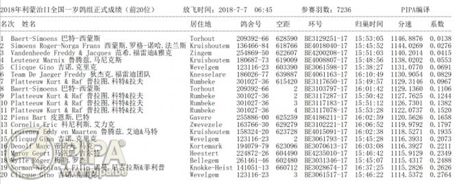 利蒙治 II比利時全國(一歲鴿7.188羽)冠軍巴特-西蒙斯(Baert-Simoens)鴿舍,該舍冠軍鴿B17-3129251灰公是在比利時時間7月7日(星期六)下午15時53分06秒歸巢,翔距628.59公里,創下平均分速1146.85米/分。
