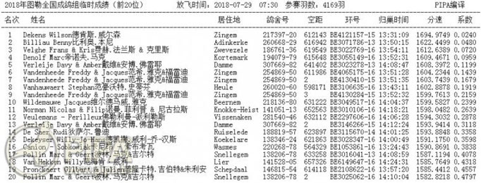 冠軍鴿B15-4121157班公是在比利時時間7月29日(星期日)中午13時31分11秒歸巢,翔距612.143公里,創下平均分速1694.83米/分,此鴿同時也是圖勒國家賽交鴿總數9.491羽的總冠軍鴿。