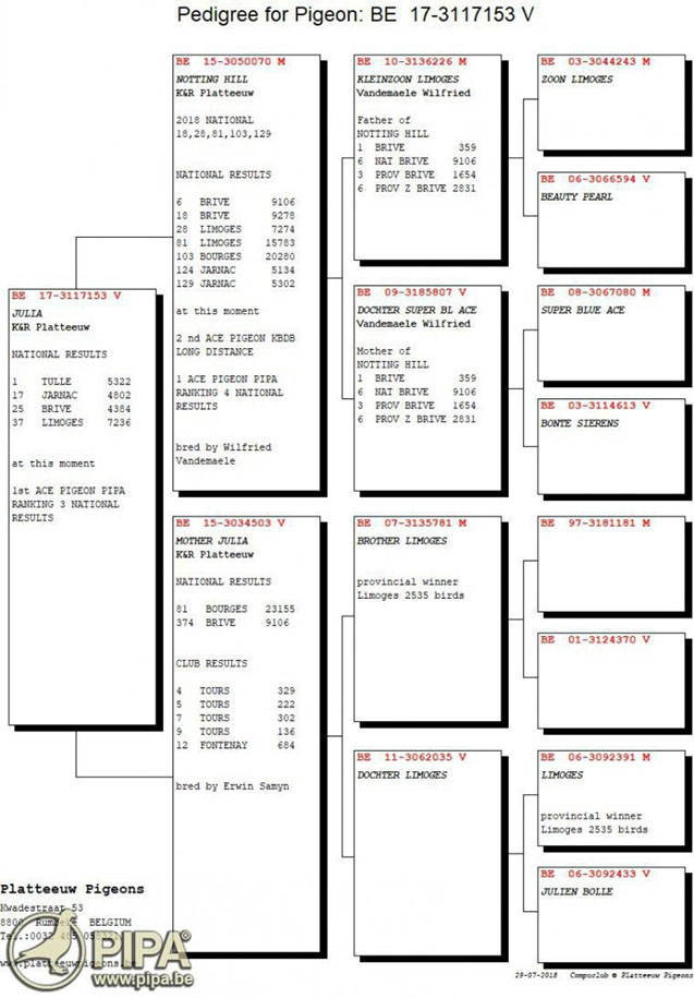 獲得比利時圖勒全國一歲鴿組5.320羽冠軍為普拉圖(Platteeuw Kurt & Raf)鴿舍,該舍冠軍鴿B17-3117153灰母是在比利時時間7月29日(星期日)中午13時46分39秒歸巢,翔距607.238公里,創下平均分速1612.21米/分,值得一提的是此冠軍鴿目前是PIPA當日歸長距離賽最佳一歲鴿(4場比賽)的鴿王排名冠軍鴿。