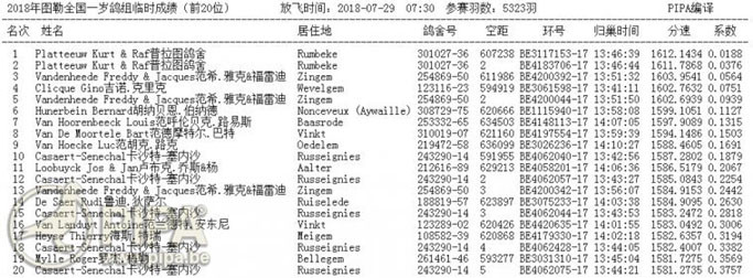 比利時圖勒全國一歲鴿組5.320羽冠軍為普拉圖(Platteeuw Kurt & Raf)鴿舍