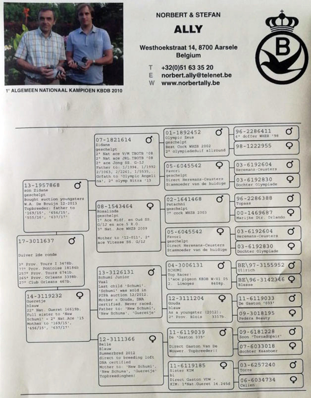 獲得比利時安格拉姆(Angouleme)國家賽一歲鴿組5.022羽冠軍為強豪亞裡.諾伯特(Ally Norbert)鴿舍,該舍冠軍鴿B17-3011637灰公是在比利時時間8月4日(星期六)下午17時00分23秒歸巢,翔距652.307公里,創下平均分速1060米/分,此鴿同時也是安格拉姆交鴿總數9.557羽的總冠軍鴿。