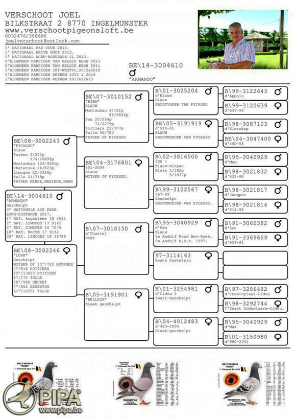獲得比利時安格拉姆(Angouleme)國家賽成鴿組4.535羽冠軍為佛斯豪特.喬爾(Verschoot Joël)鴿舍,該舍冠軍鴿B14-3004610灰斑公是在比利時時間8月4日(星期六)下午17時16分16秒歸巢,翔距641.509公里,創下平均分速1016.22米/分。
