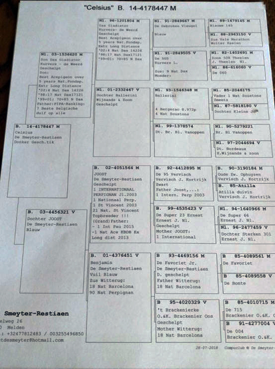 想當然爾(強調!),攝氏號的血統中可以發現大量榮獲波品納國際冠軍的佑斯特號血統,像佑斯特號這樣本身為頂尖賽鴿以及優秀種鴿在世界上又有多少呢? 血統還是血統….真是不可思議! 攝氏號的母親是佑斯特號和班雅敏號(平輩鴿偉特拉號獲得貝吉拉克全國18名)之女,攝氏號的父鴿則來自荷蘭的純長距離家族,其父為庫佛斯-迪威德系的達克斯角鬥士號之子,祖母則是來自韋南德父子的巴萊裡尼號以及灰色範諾本號。
