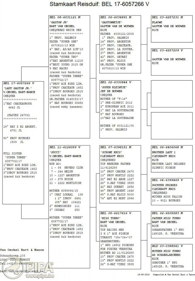 獲得比利時查特盧斯III一歲鴿組4.642羽冠軍范歐克.巴特&南茜夫婦(Van Oeckel Bart & Nance)鴿舍,該舍冠軍鴿B17-6057266斑母是在比利時時間8月18日(星期六)下午14時46分45秒歸巢,翔距556.147公里,創下平均分速1367.29米/分,此鴿同時也是查特盧斯III全國交鴿總數24.783羽的總冠軍鴿。