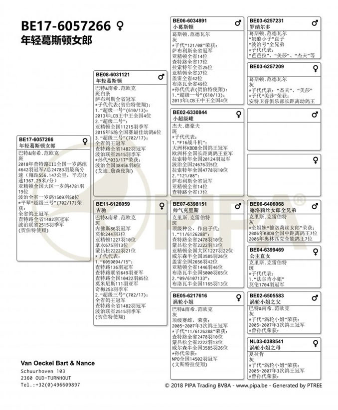 2018年比利時查特盧斯III全國總數24.783羽冠軍鴿B17-6057266斑母 中文翻譯血統書