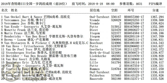 比利時查特盧斯III一歲鴿組4.631羽前20位鴿舍成績表