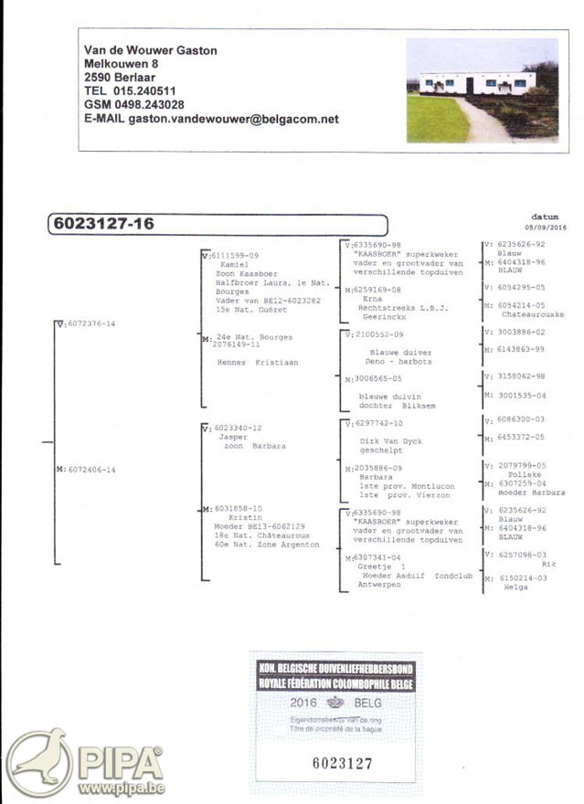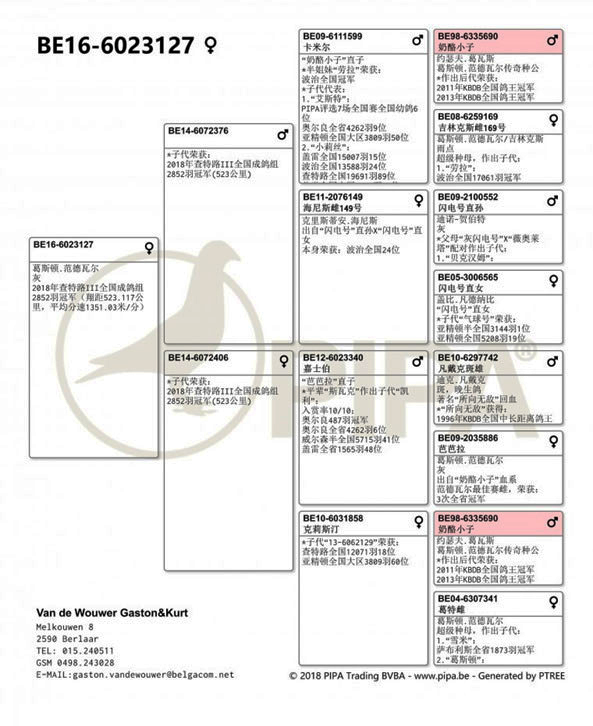 獲得比利時查特盧斯III成鴿組2.852羽全國冠軍為老將范德瓦爾.葛斯頓(Van de Wouwer Gaston)鴿舍,該舍冠軍鴿B16-6023127灰白羽.母,是在比利時時間8月18日(星期六)下午14時27分12秒歸巢,翔距523.117公里,創下平均分速1351.03米/分。