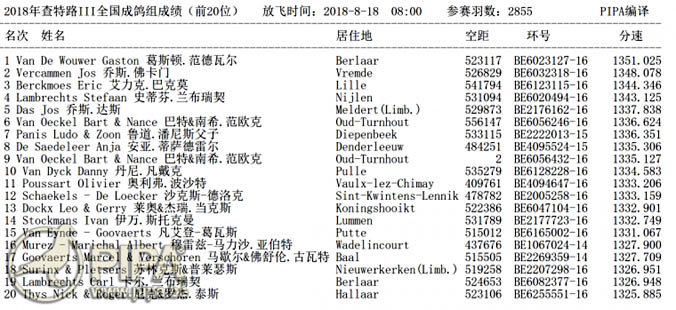 比利時查特盧斯III成鴿組2.855羽前20位鴿舍成績表