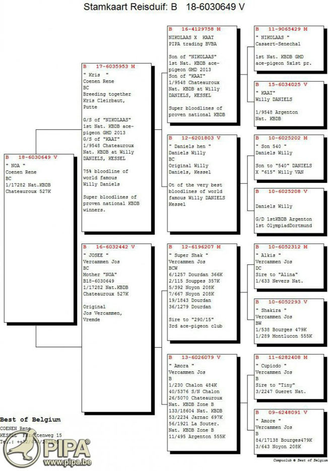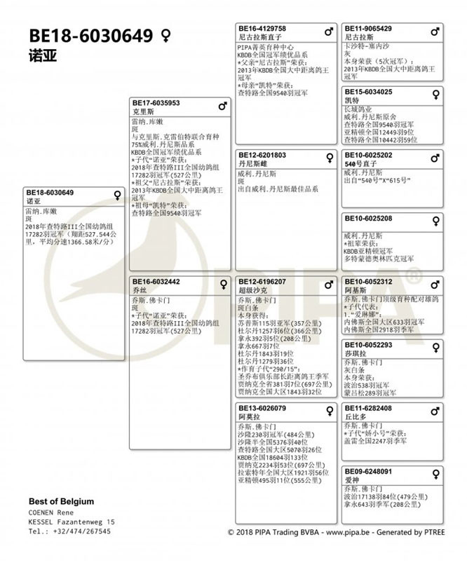 獲得比利時查特盧斯III幼鴿組17.289羽全國冠軍為雷納.庫嫩(Rene Coenen)鴿舍,該舍冠軍鴿B18-6030649斑母是在比利時時間8月18日(星期六)下午14時26分02秒歸巢,翔距527.544公里,創下平均分速1366.58米/分。