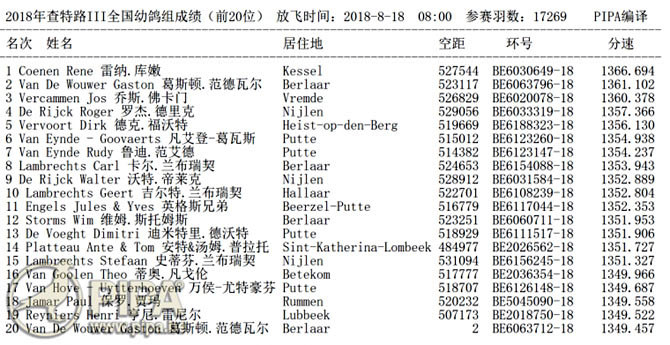 比利時查特盧斯III幼鴿組17.269羽前20位鴿舍成績表