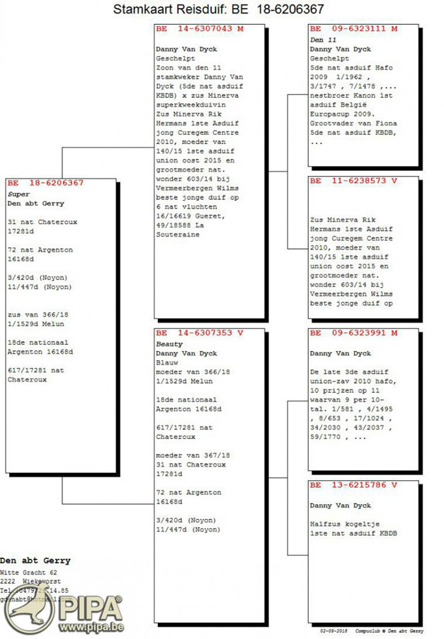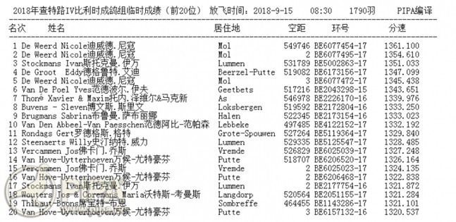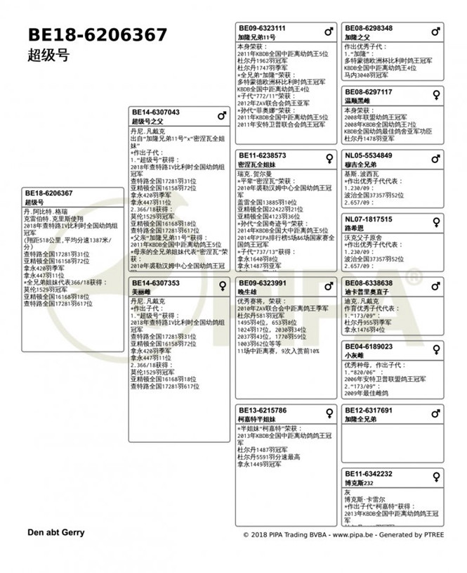 2018年比利時查特盧斯IV "成鴿組"1.790羽全國冠軍B17-6077454銀公 中文翻譯血統書