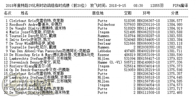 獲得比利時查特盧斯IV幼鴿組12.846羽冠軍為克雷伯特.克里斯(Cleirbaut Kris)鴿舍,該舍冠軍鴿