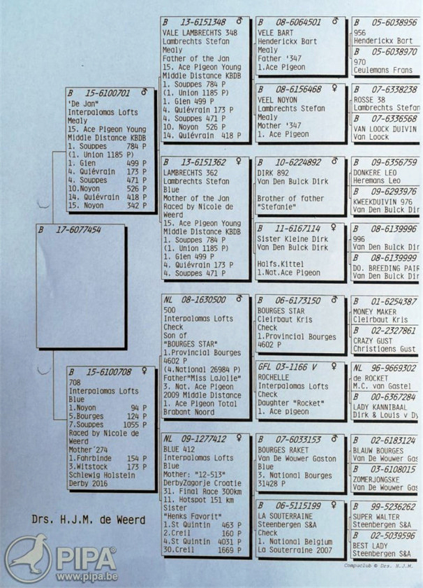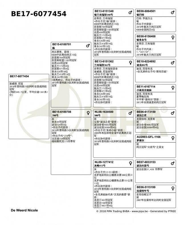 獲得比利時查特盧斯IV"成鴿組"1.790羽全國冠軍為迪威德.尼寇(De Weerd Nicole)鴿舍,該舍冠軍鴿B17-6077454銀公,是在比利時時間9月15日(星期六)下午15時13分53秒歸巢,翔距549.746東里,創下平均分速1361.15米/分。