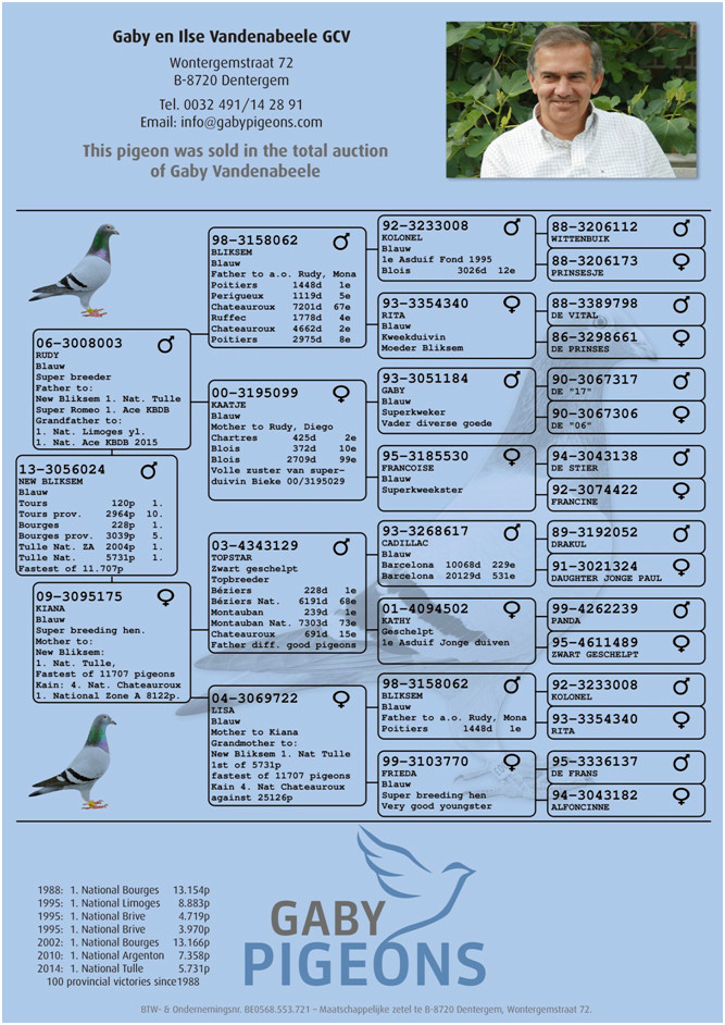其中蓋比的新一代超級種鴿”新閃電號”B13-3056024灰公,以破記錄的新高價376.000euro.拍出(約新台幣$1,350萬元)。
