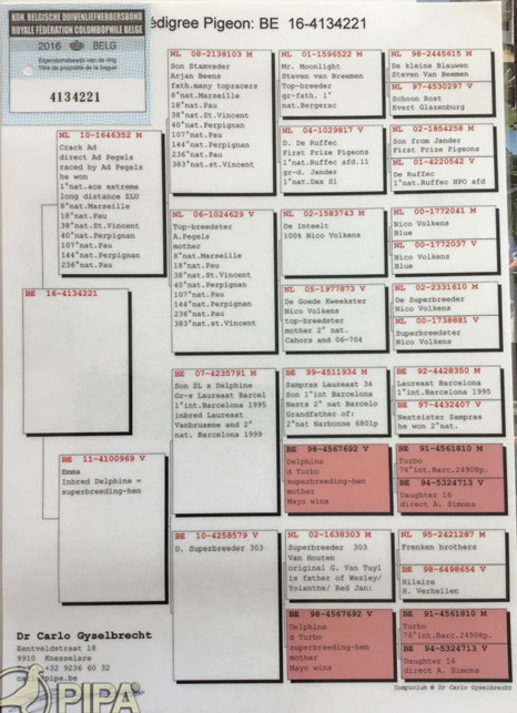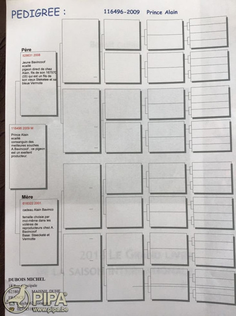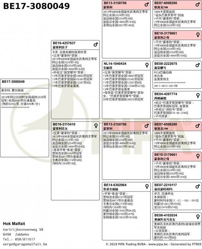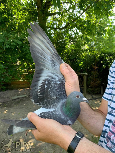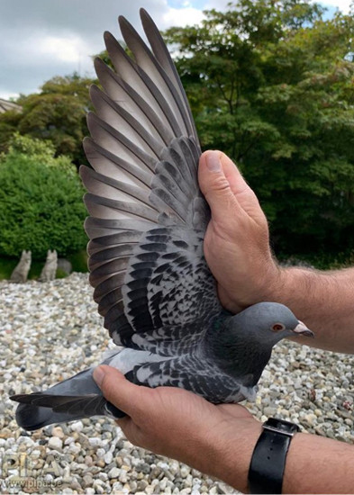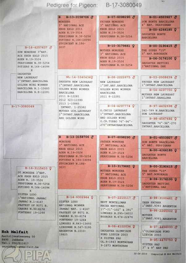 2019年阿讓國際賽比利時全國"成鴿組"冠軍B17-3080049斑白羽.公 中文翻譯血統書