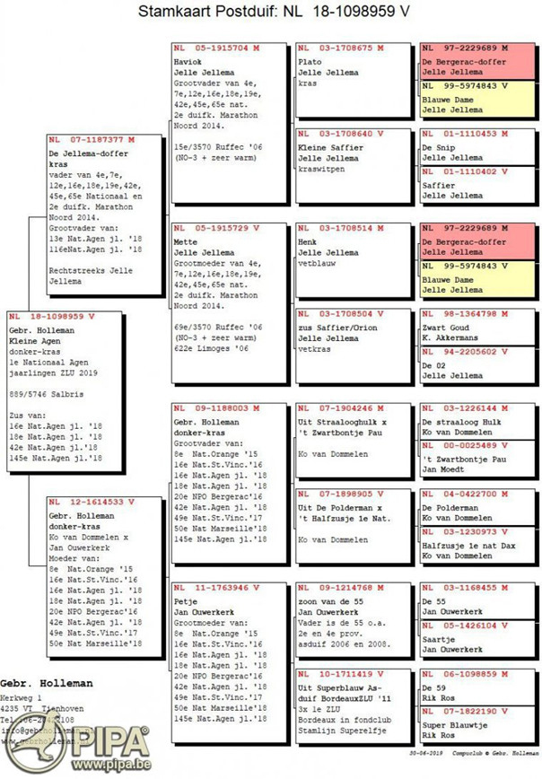 2019年阿讓國際賽荷蘭全國"一歲鴿組"冠軍NL18-1098959斑母 血統書
