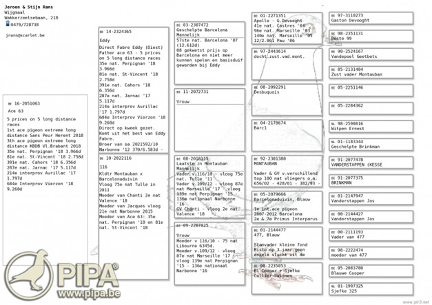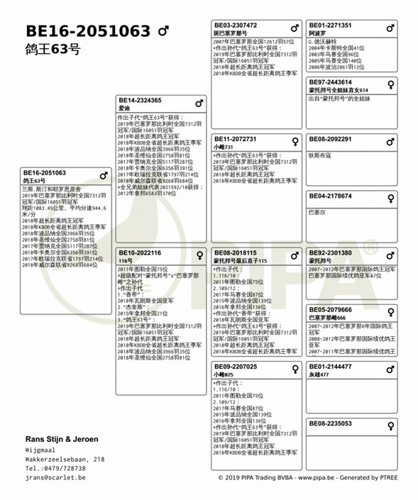獲得2019年巴賽隆納國際賽16.051羽總冠軍為比利時蘭斯.斯汀和耶羅恩(Rans Stijn & Jeroen)鴿舍,該舍冠軍鴿B16-2051063灰公是在比利時時間7月6日(星期六)上午11時6分59秒歸巢,翔距1083.45公里,創下平均分速944.61米/分。