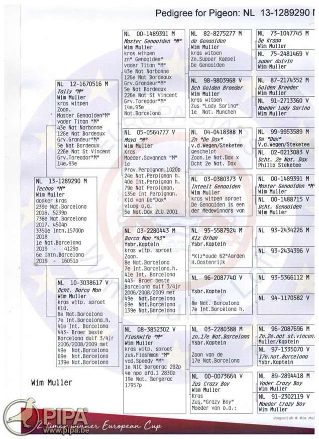 荷蘭全國冠軍(國際16.051羽6位)為威廉.穆勒(Muller Wim)鴿舍