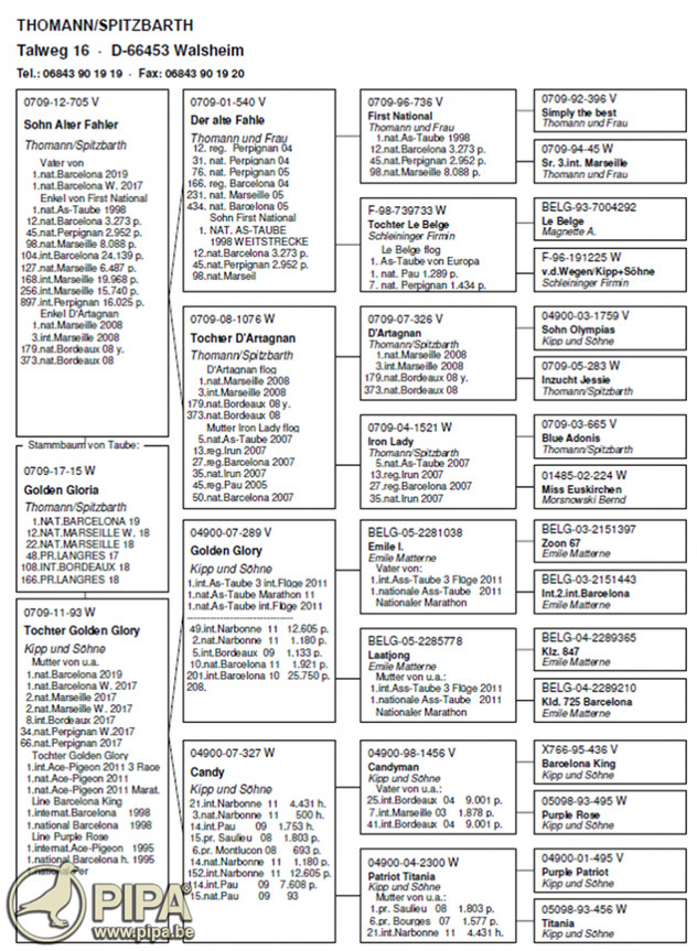 巴賽隆納德國全國冠軍為托曼-史畢茲巴斯(Thomann-Spitzbarth)鴿舍,該舍冠軍鴿DV0709-17-15灰母是在比利時時間7月6日(星期六)上午10時54分20秒歸巢,翔距962.428公里,創下平均分速847.71米/分。