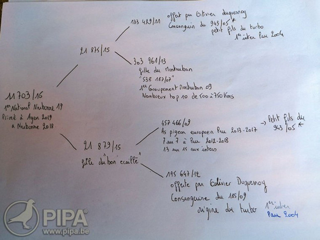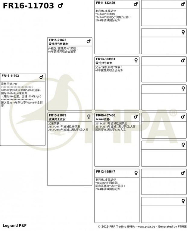 獲得2019年拿邦國際賽18.094羽總冠軍為法國雷格蘭德.P&F(Legrand P & F)鴿舍,該舍冠軍鴿FR16-11703斑公(成鴿)是在比利時時間7月29日(星期一)下午18時25分04秒歸巢,翔距844.063公里,創下平均分速1259.67米/分。