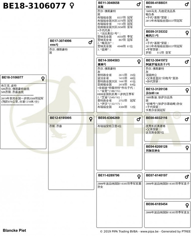 拿邦比利時全國"一歲鴿組3.580羽"冠軍布蘭克.皮特(Blancke Piet)鴿舍,該舍冠軍鴿B18-3106077斑母是在比利時時間7月29日(星期一)晚上19時19分33秒歸巢,翔距876.805公里,創下平均分速1210.14 米/分。