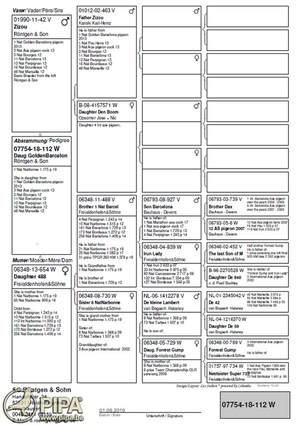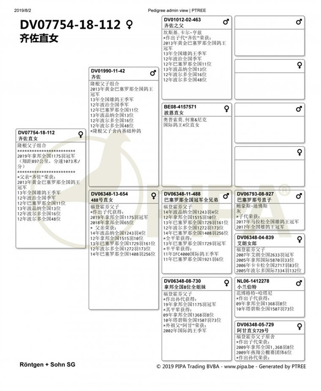 拿邦德國全國"一歲鴿組"冠軍隆根父子組合(Röntgen + Sohn SG)鴿舍,該舍冠軍鴿DV07754-18-112斑母是在比利時時間7月29日(星期一)晚上21時10分53秒歸巢,翔距897.564公里,創下平均分速1073.79米/分。
