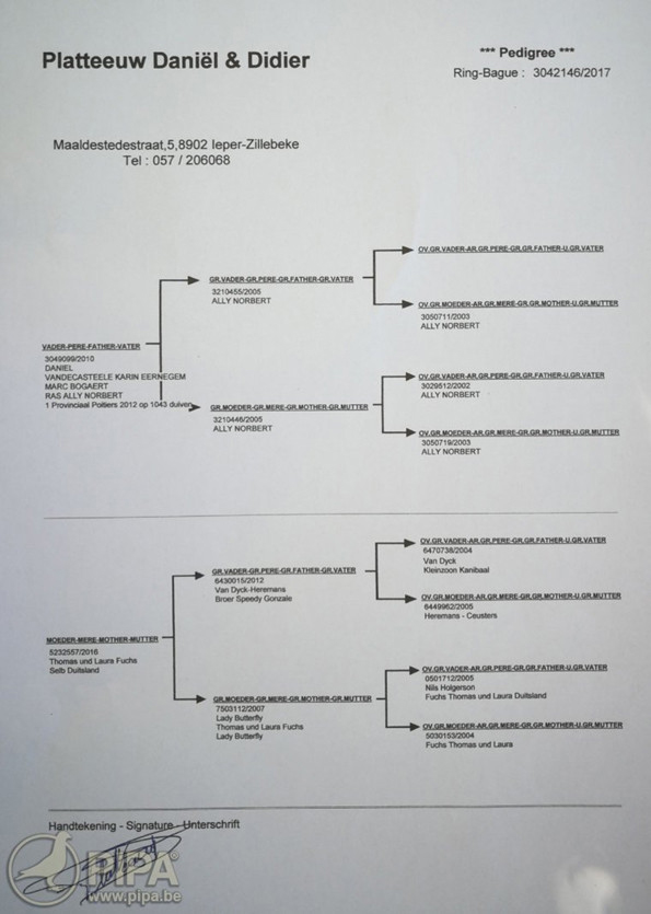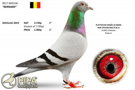 獲得比利時蘇雅克全國(成鴿3.738羽)冠軍為普拉圖 丹尼爾&迪迪(Platteeuw Daniël & Didier)鴿舍,該舍冠軍鴿B17-3042146灰公是在比利時時間7月29日(星期一)下午15時01分03秒歸巢,翔距669.43公里,創下平均分速1391.6米/分。此鴿同時也是交鴿總數7.794羽的總冠軍鴿。