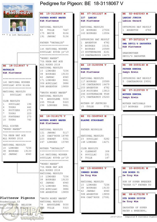蘇雅克比利時全國"一歲鴿組4.056羽"冠軍為普拉圖(Platteeuw Kurt & Raf)鴿舍,該舍冠軍鴿B18-3118067灰母是在比利時時間7月29日(星期一)下午15時15分26秒歸巢,翔距682.017公里,創下平均分速1376.61米/分。