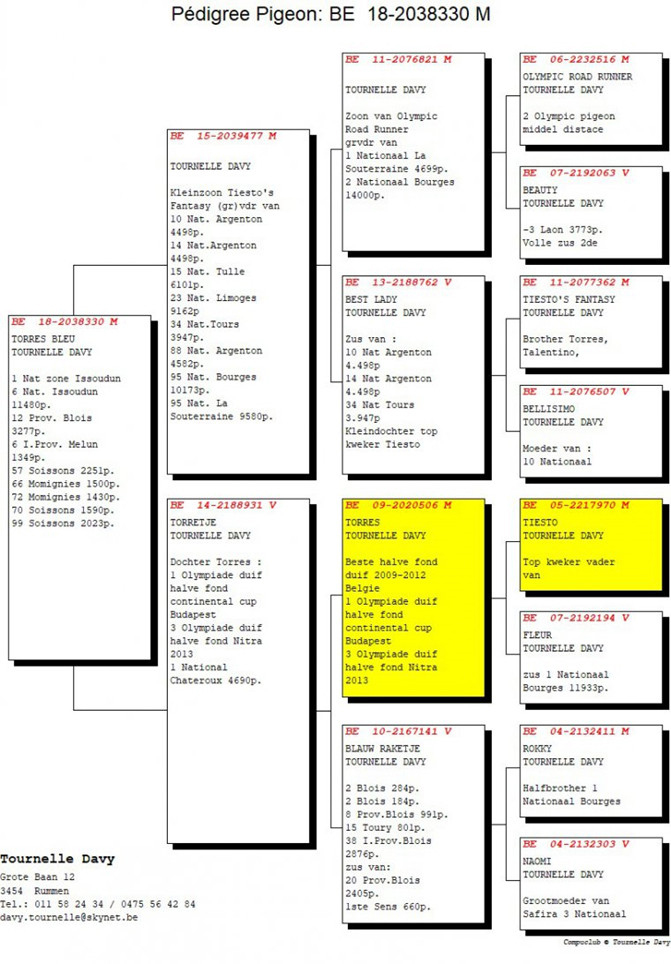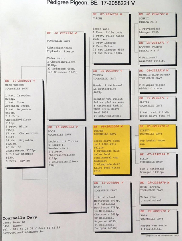 “托雷斯小姐”的父親是“鐵斯托”(Tiësto)的曾孫。祖母“泰莎”(Thasja)作出子代榮獲拉索特年全國4,699羽冠軍。“泰莎”的母親“塞菲拉”(Safira)是2009年KBDB全省大中距離鴿王季軍。“托雷斯小姐”的外祖父是超級巨星“托雷斯”(Torres)。“托雷斯”是“鐵斯托”直子,吐尼爾的另一羽基礎種鴿。“托雷斯”本身榮獲查特路全國4,690羽冠軍,並且是2009-2012年比利時長距離最佳賽將。此外,他作出的後代也繼承了他的優秀傳統。“托雷斯小姐”就是個很好的例子。外祖母“蘿西”榮獲蒙呂松全省冠軍。