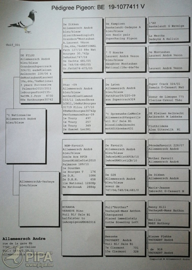 獲得比利時亞精頓 II全國(幼鴿組)23.229羽冠軍為阿勒梅斯 安德列(Allemeersch André)鴿舍,該舍冠軍鴿B19-1077411灰母是在比利時時間8月24日(星期六)下午14時10分7秒歸巢,翔距480.253公里,創下平均分速1297.57米/分,此鴿同時也是交鴿總數28.411羽的總冠軍鴿。