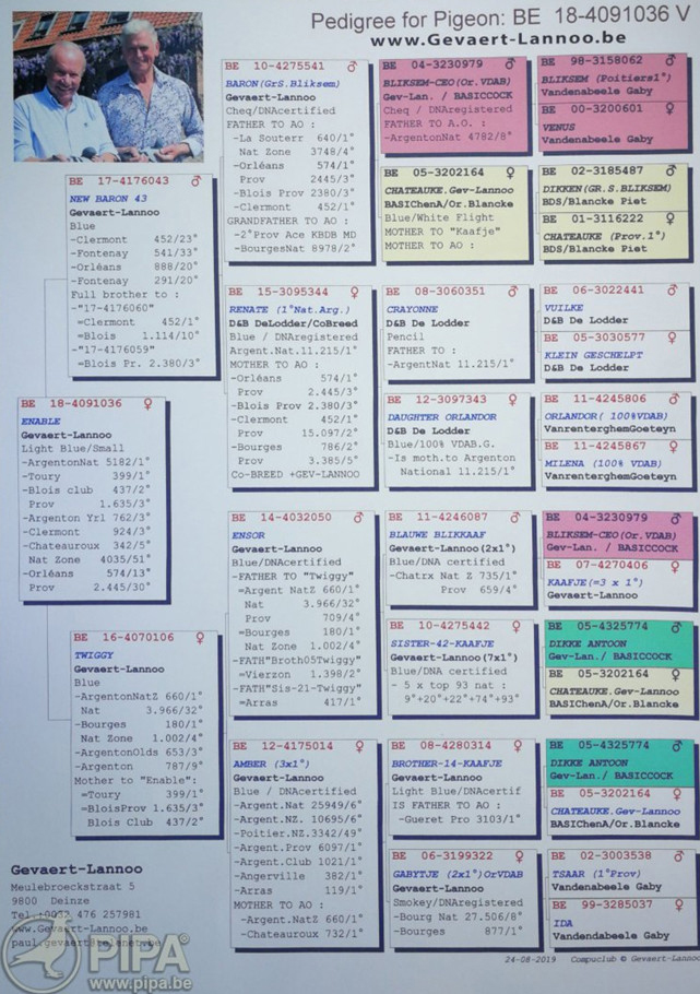 獲得比利時亞精頓 II全國"成鴿組5.182羽"冠軍吉瓦特-蘭努(Gevaert-Lannoo)鴿舍,該舍冠軍鴿B18-4091036灰母是在比利時時間8月24日(星期六)下午14時42分01秒歸巢,翔距512.195公里,創下平均分速1274.06米/分。