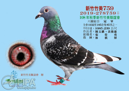 台灣秋季北海新竹竹美聯誼會是台灣最艱苦的比賽。竹美會是台灣唯一沒有兩場資格賽的鴿會,這意味著幼鴿必須直接參加正式進關採計成績;同時竹美會的有格分數700米/分,也整整比其他台灣鴿會600米/分,分數多了100米/分,這代表同樣放飛條件下的賽鴿,竹美會失格的時間整整比其他人提早約1個小時。台灣的海翔賽制,向來都是世界最艱困的比賽,最初的參賽羽數則是4432羽,完成決賽的賽鴿僅有85羽。經過6關正式比賽後,賽鴿TW19-278759斑白羽.母,在這項鴿王賽中佔據領先。台灣秋季北海賽鴿王成為台灣鴿界議論的熱點:這項傑出成績被認為是過去20年間巴騰伯格鴿系最優秀賽績。