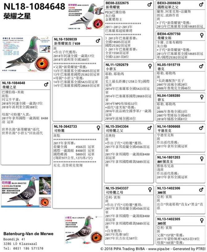 鴿王冠軍的父親NL18-1084648斑公,出自(“新榮耀號X “小碧玉”) 直子”(NL16-1509039斑公 Son New Laureaat),這是來自2羽巴塞羅納國際冠軍鴿互配作出。