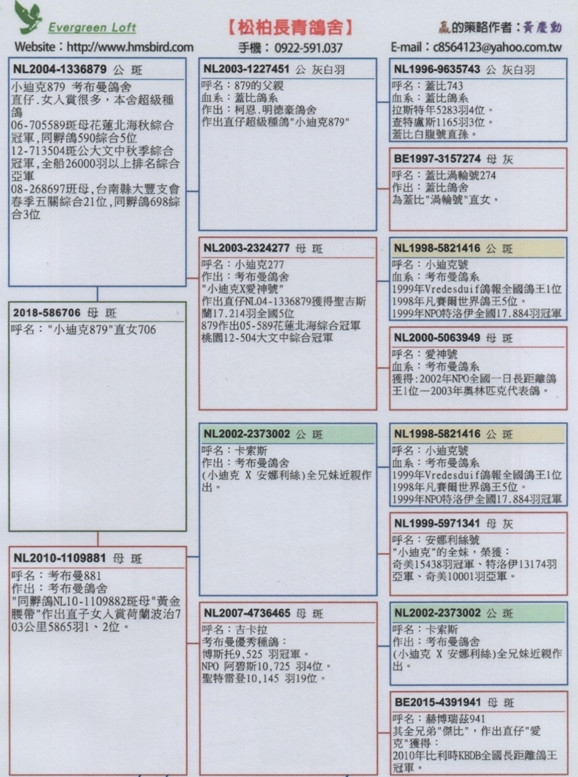 鴿王冠軍的母親出自黃慶勳鴿舍“小迪克879直女”18-586706斑母。