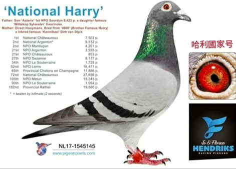 亨得力士的「巨星哈利」NL17-1545145145灰公,2017年生,灰黃眼公,「哈利」全兄弟的外孫:NPO查特路542公里7.503羽冠軍;更以NPO大賽冠軍-亞軍;亞軍鴿還入選NPO全國鴿王冠軍候選名單,也正式退役,安心當種鴿!