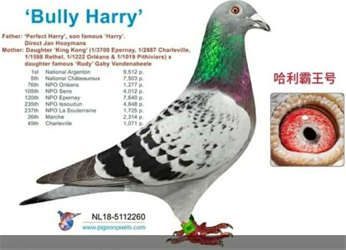 胡曼斯本舍的「勇敢哈利」,2017年生,斑砂眼公,「哈利」的外孫:NPO查特頓8.815羽冠軍,27.000羽最高分速!